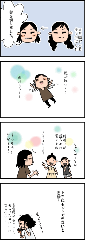 PR 4コマ漫画760話 4人の子供と鬼ばば母ちゃん 2011.08.262024.03.09 長女と次女も一緒に美容院に行ったんだけど、彼女らは整える程度で短くしない。 それでも3ヶ月に1回とかだから、かなりスッキリするみたい。 私はついつい我慢できずイメチェンを狙ってしまう( ´,_ゝ` )←懲りろ 久しぶりに「DEATH NOTE」読んでます。ミサミサどうなったんかなぁ