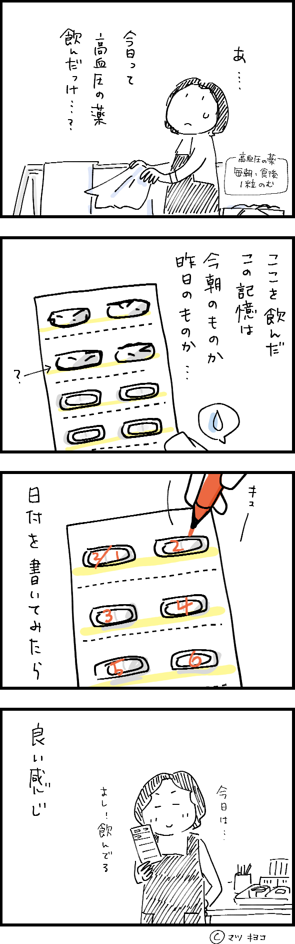 この先、薬の数が増えたらお薬カレンダーも検討する。